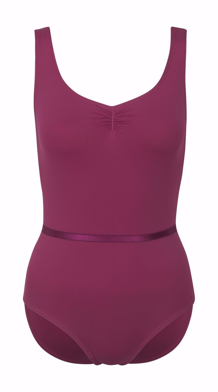 Sleeveless front ruche leotard with matching colour coordinated belt. Bralet lined from size 2 upwards.